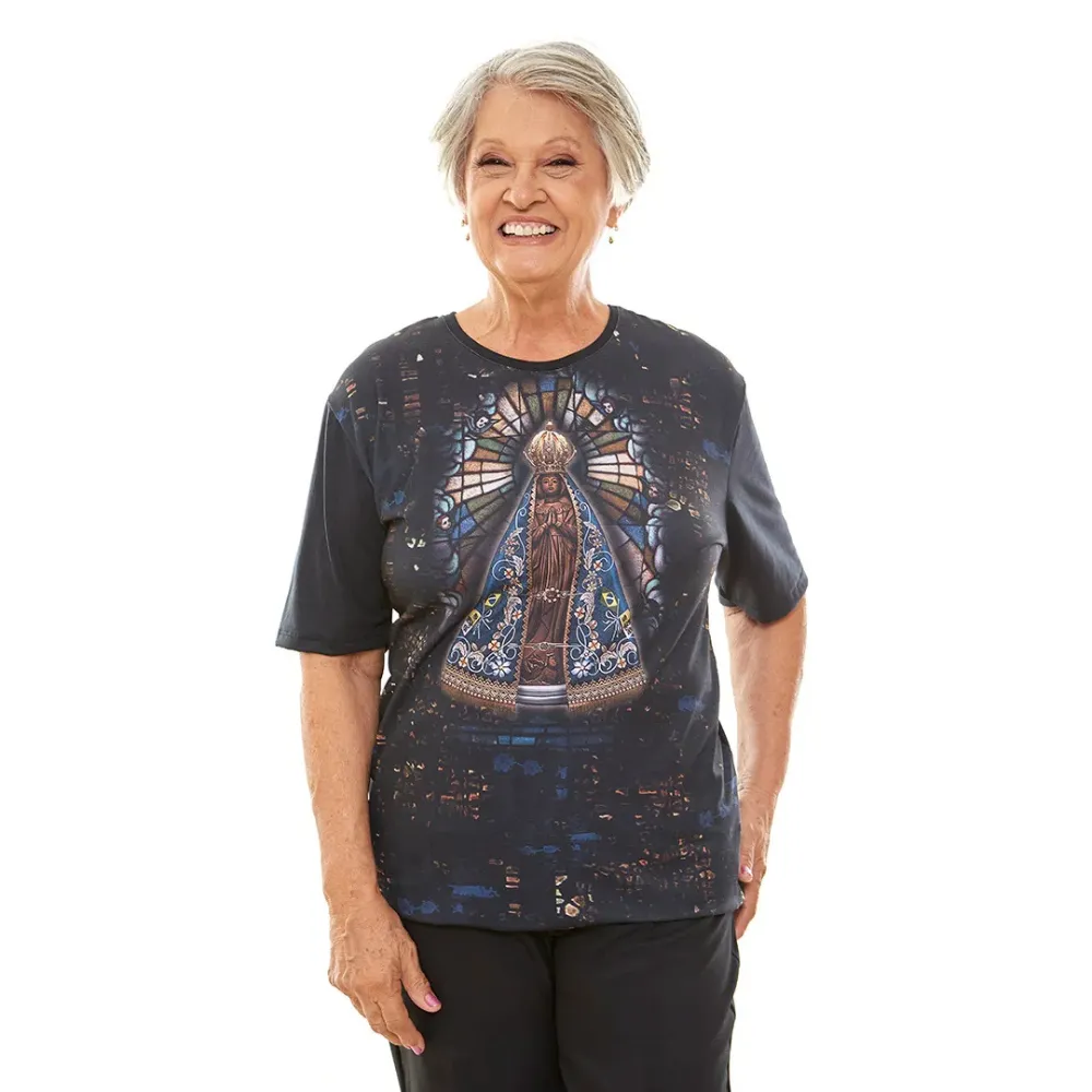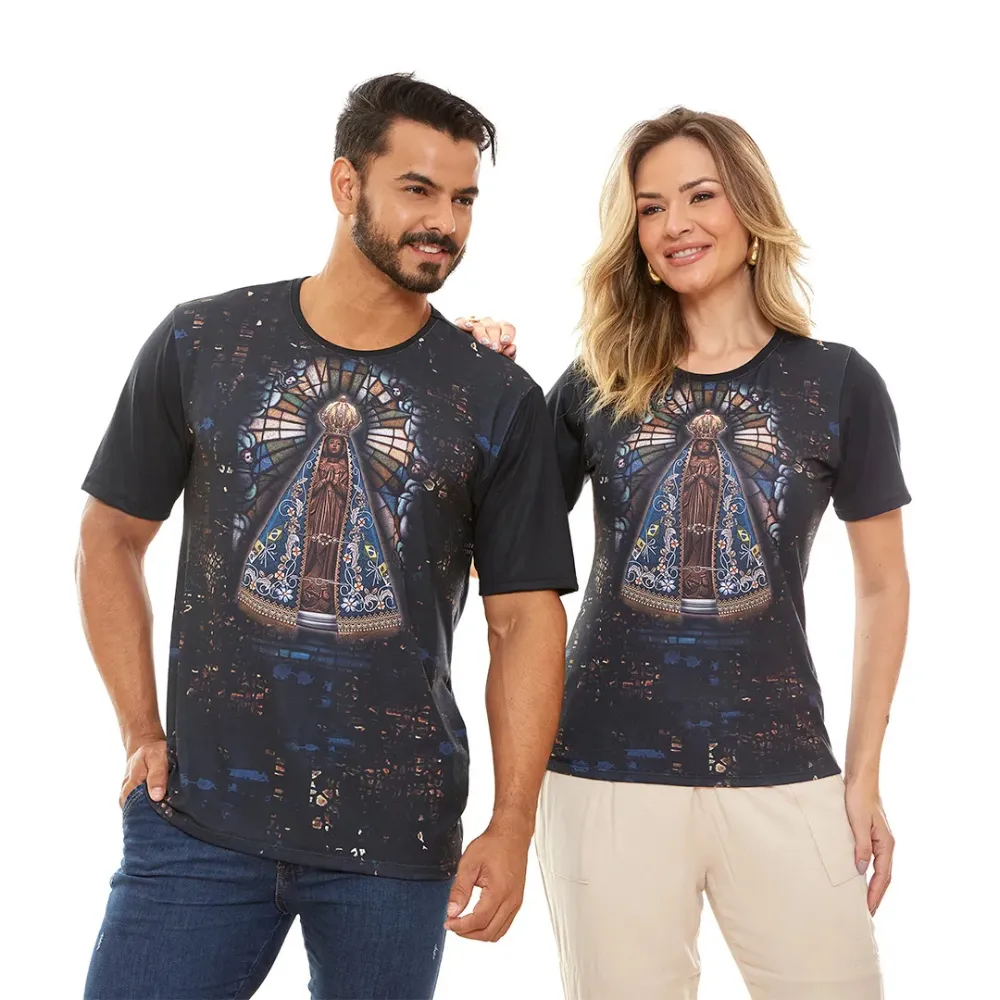 Camiseta católica com estampa de Nossa Senhora Aparecida em tecido macio e confortável na cor preta. Impossível não amar essa camieta e querer vestir em todos os momentos especialmente pela sua delicadeza. Perfeita para vestir o casal com amor e devoção. Disponível na versão feminina e masculina. Vista-se de amor. Use Ágape. Pode haver variações de medidas nas peças de até 2 cm, na largura e comprimento. A depender da malha utilizada no processo de confecção, pode haver variação no tamanho da peça para garantir melhor vestibilidade