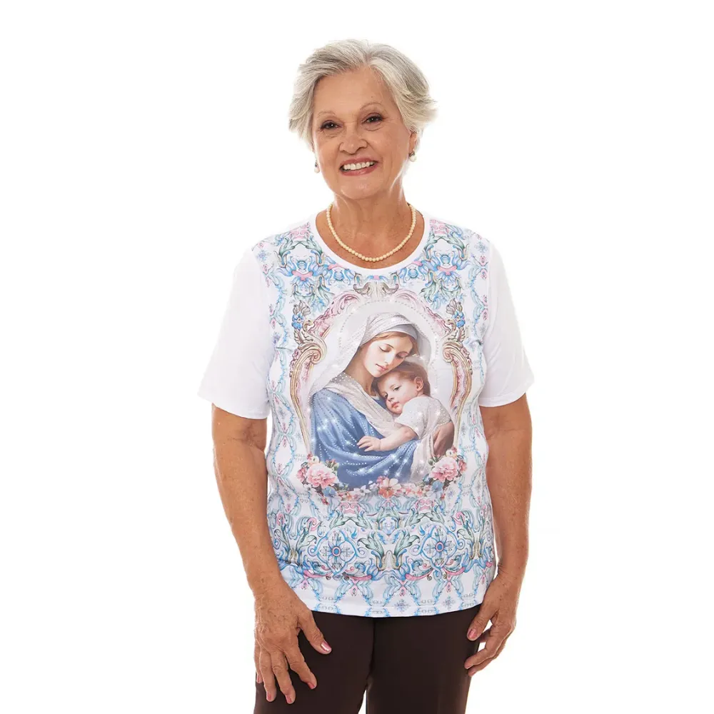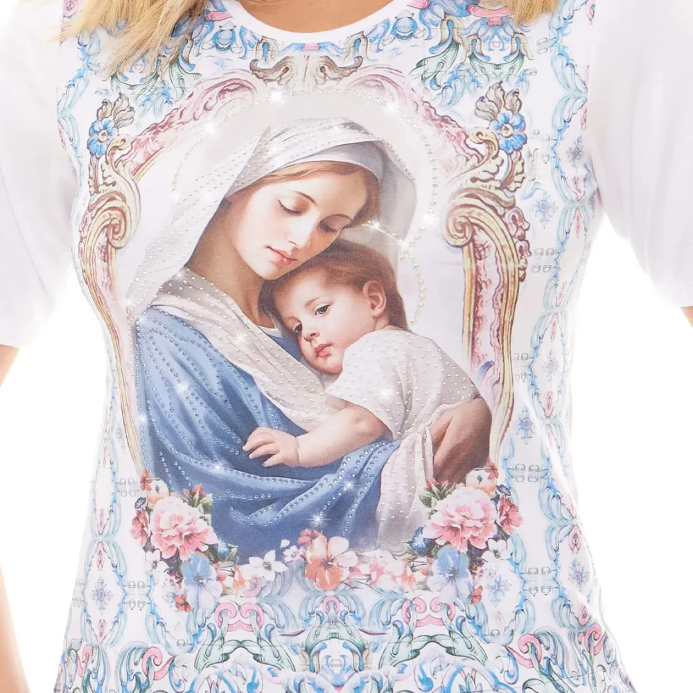 Baby Look Mãe Puríssima com lindos detalhes na estampa enaltecendo a imagem. Na cor branca, em tecido confortável e suave ao toque é uma peça que combina com tudo e dará um toque delicado e romântico aos seus looks. A modelagem da peça se ajusta perfeitamente no corpo. Vista-se de amor. Use Ágape. a técnica de estamparia utilizada.