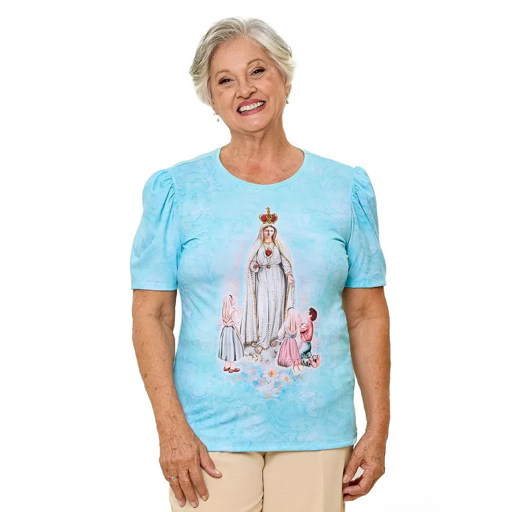 Nossa Senhora de Fátima é um farol de esperança e fé em tempos de dificuldades. Sua presença nos chama à oração e à conversão do coração. Sob seu manto, encontre a paz que transcende. -Pode haver variações de medidas nas peças de até 2 cm, na largura e comprimento. -A depender da malha utilizada no processo de confecção, pode haver variação no tamanho da peça para garantir melhor vestibilidade. -As estampas podem conter fissuras apresentadas nas mangas e nas laterais, devido a técnica de estamparia utilizada.