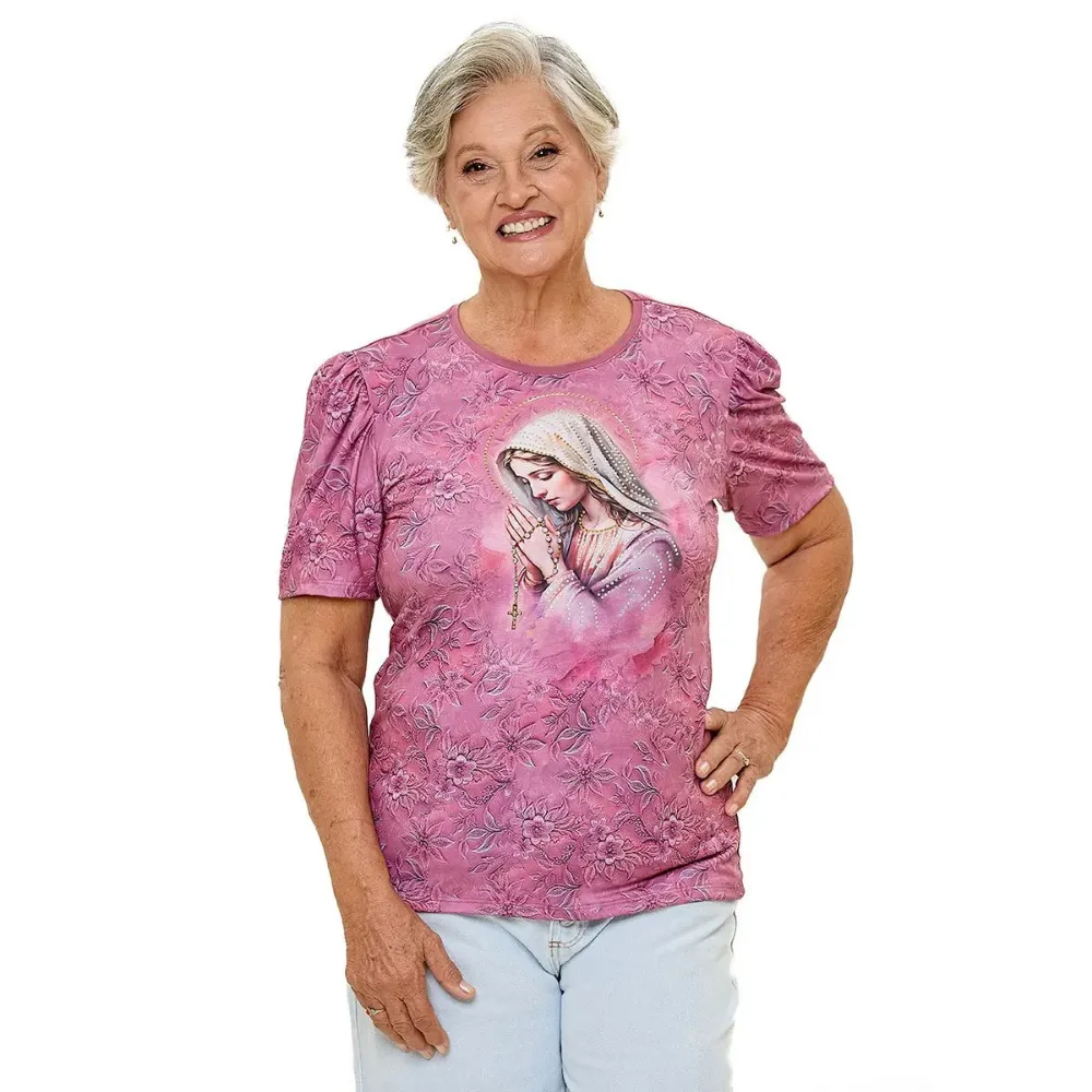 Nossa Senhora do Rosário é venerada como a intercessora que nos conduz à oração e à paz através da recitação do Santo Rosário. Esta devoção destaca a meditação sobre os mistérios da vida de Jesus e de Maria. A festa de Nossa Senhora do Rosário, celebrada em 7 de outubro, reforça a importância da oração diária. Ela é considerada uma poderosa protetora contra os males e dificuldades da vida. -Pode haver variações de medidas nas peças de até 2 cm, na largura e comprimento. -A depender da malha utilizada no processo de confecção, pode haver variação no tamanho da peça para garantir melhor vestibilidade. -As estampas podem conter fissuras apresentadas nas mangas e nas laterais, devido a técnica de estamparia utilizada.