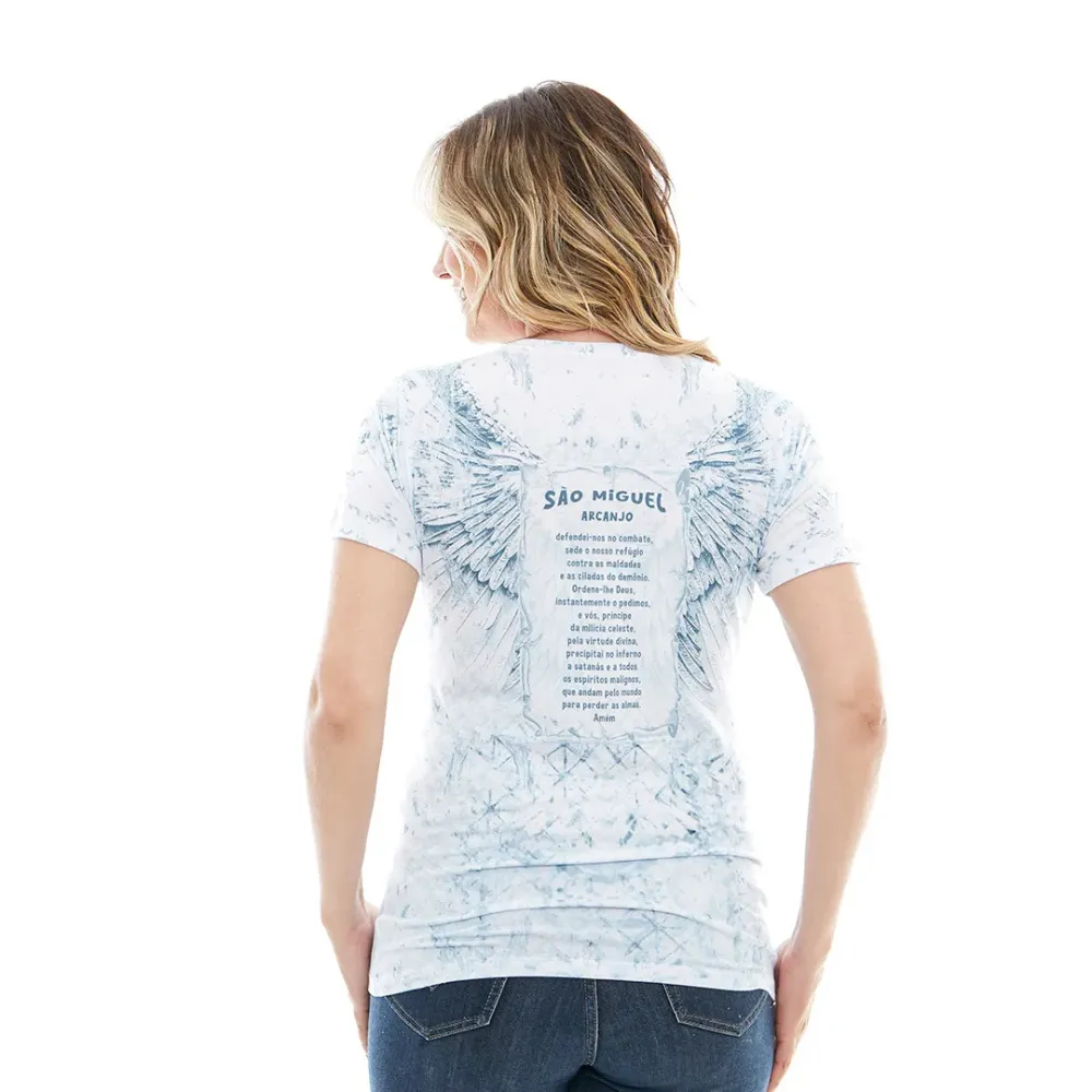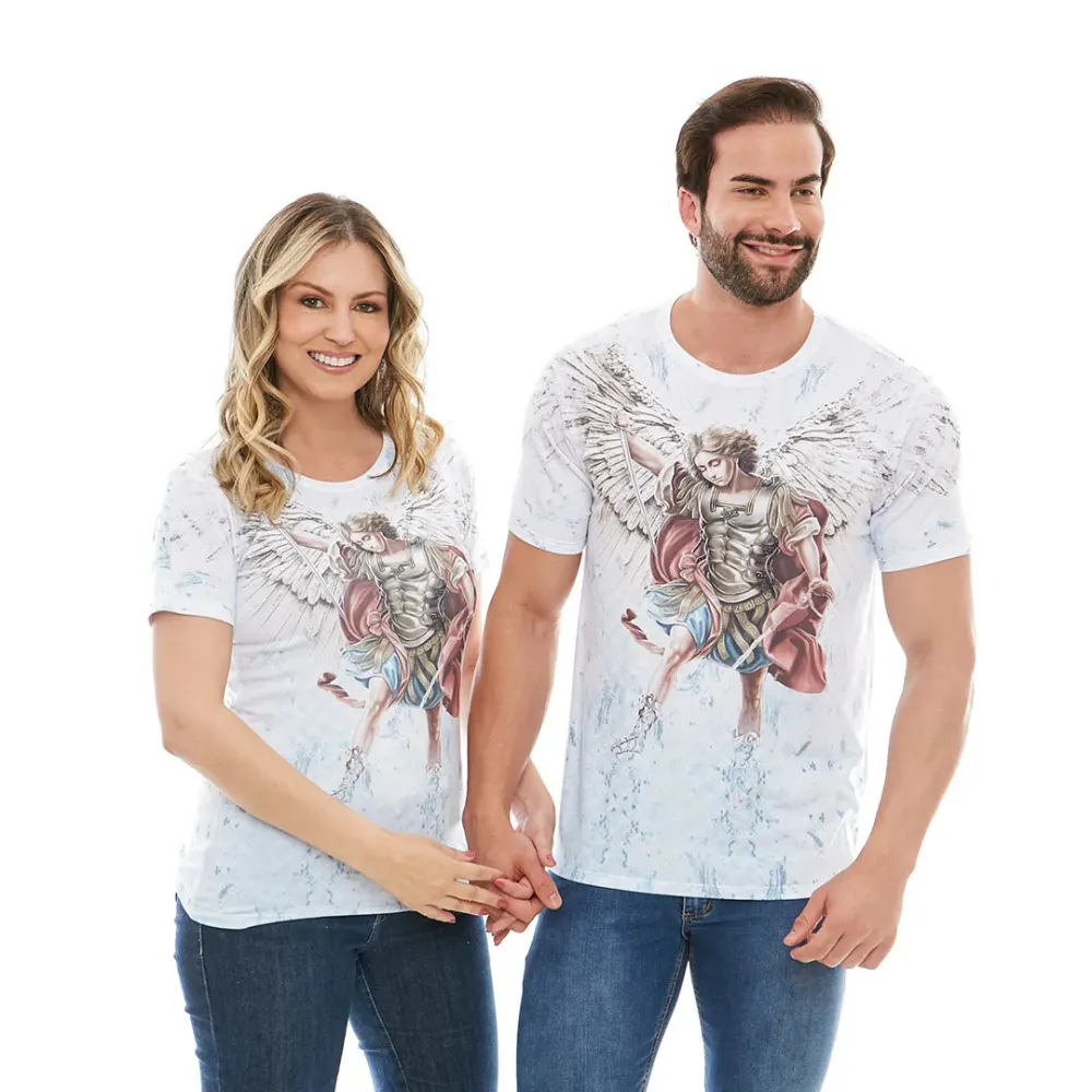 Camiseta São Miguel Arcanjo em estampa com riqueza de detalhes para vestir em momentos especiais. Camiseta estampada com imagem de São Miguel, Príncipe da milícia celeste, na cor branca, em tecido macio e confortável. Ideal para vestir durante a quaresma de São Miguel e em grandes solenidades. -Pode haver variações de medidas nas peças de até 2 cm, na largura e comprimento. -A depender da malha utilizada no processo de confecção, pode haver variação no tamanho da peça para garantir melhor vestibilidade. -As estampas podem conter fissuras apresentadas nas mangas e nas laterais, devido a técnica de estamparia utilizada.