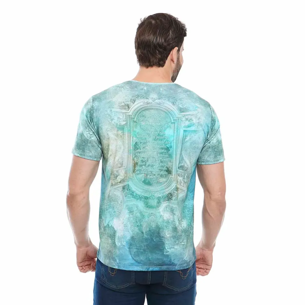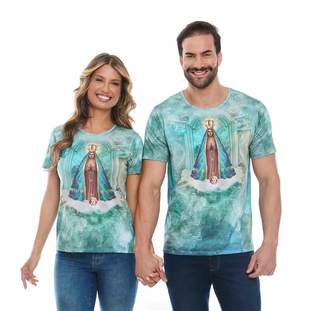 Camiseta Nossa Senhora Aparecida com estampa na frente e Jesus Misericordioso nas costas para um visual único e cheio de devoção. Em tecido macio e confortável, com durabilidade surpreendente é uma peça perfeita para participar da santa missa, grupo de oração e festividades na paróquia. Use Ágape. -Pode haver variações de medidas nas peças de até 2 cm, na largura e comprimento. -A depender da malha utilizada no processo de confecção, pode haver variação no tamanho da peça para garantir melhor vestibilidade. -As estampas podem conter fissuras apresentadas nas mangas e nas laterais, devido a técnica de estamparia utilizada.