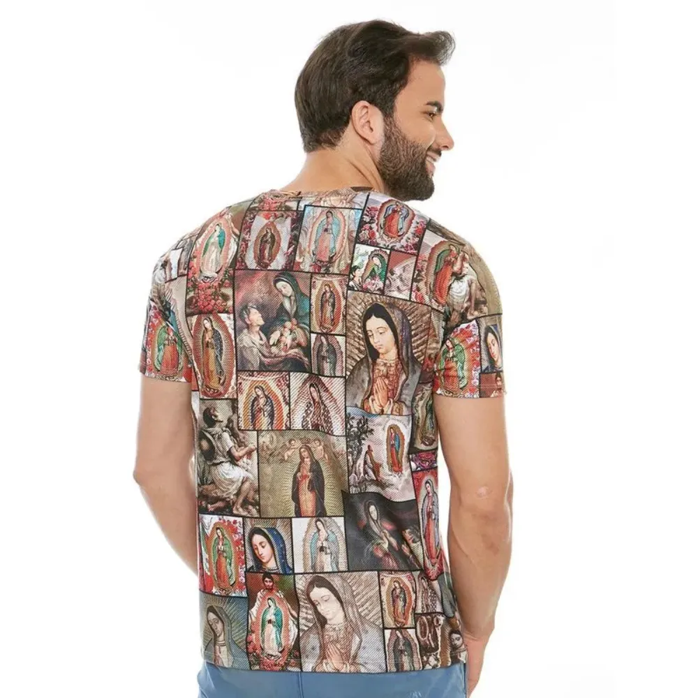 Camiseta Nossa Senhora de Guadalupe -Pode haver variações de medidas nas peças de até 2 cm, na largura e comprimento. -A depender da malha utilizada no processo de confecção, pode haver variação no tamanho da peça para garantir melhor vestibilidade. -As estampas podem conter fissuras apresentadas nas mangas e nas laterais, devido a técnica de estamparia utilizada.